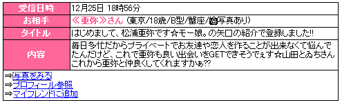 ≪海田姉妹≫さん (東京/48歳/A型/蟹座/写真あり) 48歳で何が女の子かと。 コイツの 『 写真あり 』 のプロフィールをクリックしてみる。 ![]() ![]() 頼むから死んでくれ。 お次はそのまんま画像で御紹介。 ![]() ![]() (*´゚ё゚) !!! ![]() 白石美帆キター!オイラ危うく、 てか、、、 ![]() どうしてオイラの名前を。。。 ![]() 名前まで登録されてる!! 出会い系サイトって、何でもアリですね。。。 ![]() は? ![]() あややキター!![]() 『 写真をみる 』 をクリック ![]() もうちょっと上手く騙そうよ、、、。 以上です。 お疲れ様でした。 ▲戻る | |||||||||
