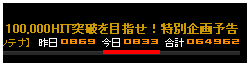 『横田めぐみ』と『横山めぐみ』がどっちがどっちだかいつも混乱する山田とゐちです。 こんにちは。 お陰様でこの『とゐち通信』 50,000HIT達成しました。【確認してみる】 わーいわーい。 思い起こせば… 最初は毒人間観察記録のみだったこのHP。 カウンターを設置した今年の7月頃は、1日に100HITあるかないかでした。 そして9月に、劇団HOTROAD本公演『新宿笑猫亭』稽古場日記が始まり、 1日300HIT前後まで伸びてきました。 本公演が終わり、このサイトを『妄想日記』メインにリニューアルした11月あたりから、 1日400、500と非常に多くの皆さんに来て頂くようになりました。 そして現在、1日平均700HIT前後を記録するようになり、とゐち通信も本格的に盛り上がってきた感じがしています。 現在右肩上がり♪ これもひとえに皆さんのおかげです! ![]() ![]() 【写真提供】黒猫亭さん 『ありがとうは態度で示せ』 小学6年生頃、嶋先生に教わった言葉です。(誰 そこで、50,000HIT突破企画! (*´゚ё゚) … ありません。 ![]() というワケで、 今のうちに『100,000HIT突破企画』を考えました。 その企画とは… 100,000HITを踏んだ方は、 3月 山田とゐち出演公演 1組2名様ご招待 更に、 100,000HIT達成記念として抽選で、 3月 山田とゐち出演公演 2組4名様ご招待 そして前回同様、 ![]() もれなくハイチュウあげます。 最大6名様 自腹でご招待!! 『何だよお前の芝居かよー』とか言わない!!!! 思ってても口にするんじゃない!!!! (激怒) しかしいくつか疑問が生まれる。 3月の公演までに100,000HIT達成しなかったら? なかったことにします。 100,000HIT踏んだ人が観に行けない人だったら? 気合いで来て下さい。 100,000HIT達成前にチケット買っちゃった人は? ご返金します。 100,000HIT踏んだ人が出演者だった場合は? その人のノルマを2枚分オイラが負担します。 100,000HIT踏んだ人が山田とゐちだった場合は? 泣きます。 イーグルスのロゴって・・・ ![]() 『 毛 』に見えます。この中で一番問題なのは、公演までに100,000HIT達成出来るかどうかだ。 いや実際のところ、仮に公演前日に達成したとしても急な話で不可能だ。 そこで期限を決めた。 2005年02月22日(火)0:00AM この日のこの時間までに100,000HIT達成しなかった場合は、 なかった事に。 その場合、次々回の6月公演でまた新企画を考える方向で。。。 果たして2月22日までに残り約50,000HIT達成できるのだろうか? 残り後75日 現在1日約700HIT 700×75=52,500HIT 達成できるはず。 というワケで、 オイラもこれからアクセスが伸びるように面白いネタや企画考えていきます。 近いうちにこのHPに登録式の相互リンクページを設けるつもりです。 HPをお持ちの方は、相互リンクしまくってこのHPを宣伝して頂けたら嬉しいです! 今までは特に宣伝活動とかしなかったんですけど、今後は皆さんのお力を借りられればなぁって思います。 最後に、今、いくつかのWebランキングというのに参加しています。 ここに観に来て下さるだけでランクアップするランキングもあるんですが、投票しないとランクアップしないのもあるんです。 それらはトップページの最新の妄想日記のすぐ下にリンクしてあります。 是非投票して頂けたらと思います。 つまんなかったら投票しなくても勿論良いです。 今日の日記は面白かった!よかった!って思った時は、投げ銭感覚で投票して頂けたら本当に嬉しいです。 明日への活力となります。 とはいえ、今日の日記はネタじゃなくてごめんなさい。 たまにはこういう真面目なのも良いかなと。。 以上です。 お疲れ様でした。 ▲戻る |