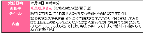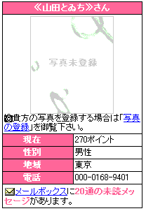 〜 本当にあった怖い話 〜 うちの会社の女の子がお客様からの電話を受けて、 「失礼ですが、何様ですか?」 と答えていた。 ![]() その後すぐに電話を代わり、その方の解約処理を承った、山田とゐちです。 こんにちは。 最近オイラのパソコンに、出会い系サイトの迷惑メールが頻繁に届くようになった。 どうやらオイラが一般公開しているYahooプロフィールを見た何者かが、 オイラのアドレスを勝手に出会い系サイトに登録しているようだ。 例えば、こんなメールが届く。 ◆ タイトル: 私の願い聞いて下さい!!