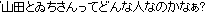 『ありがとうございました』と言う銀行のATMに向かって『ご苦労さま』と返事しているおじいちゃんに涙ぐんだ山田とゐちです。 こんにちは。 まずはお知らせから。 ■ 其の壱 おばあさんの秘密、久々に更新しました! 新事実4つに加え、黒猫亭さんがおばあさんのイラストを送ってくれました! ![]() 拡大されたものはおばあさんの秘密で観られます (゜∀゜) 激ウマー!!! オイラ、とっても感動しとります。 こんなとゐち通信の為に時間を割いてイラスト投稿して下さるなんて… 嬉し涙でモニターがかすんでよく見えません。 手が震えて上手くタイピグができあmsえん!!1 文字でこの感動をお伝えしきれていないのがとても悔しいです。 他にもこんな馬鹿げた行為を真剣にやって頂ける方がいらっしゃったら、是非投稿して下さいね。 添付ファイルが送れるメールフォームはこちらにあります。 そう、 馬鹿げてたって良いじゃないか。 馬鹿げてようとアホ扱いされようと、その人が必死で誰かの為に取り組めば、 感動を呼ぶ力が生まれるんです。 役者もそういうモノだとオイラは思ってます。 良い事言った!山田とゐち!! だからオイラはこのHPで馬鹿ばっかりやってるんです。 でも感動はない。 _| ̄|○ ガクッ ■ 其の弐 先日の日記で公約した100,000HIT達成特別企画。 そのページを作りました。 こちらのページにアクセスして頂き、今一度ルールと応募方法を御確認下さい! ■ おたより御紹介 とゐち通信宛に届いたメールの中から幾つか御紹介させて頂きます。 【かずとさん】