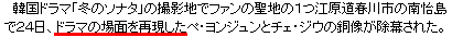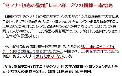 過去、おばあさんの秘密へイラスト投稿してくれた黒猫亭さんが、凄いの描いてくれたよ! ![]() (*´゚ё゚) !!! ![]() 【写真】 杉山美法さん撮影の新宿笑猫亭写真集より ひふみとチィチィだー!! とゐち通信を通じて生まれた 杉山美法さんと黒猫亭さんの見事なるコラボレーション作品!! の山田とゐちです。こんにちは。 こんな記事を見つけた。 ![]() クリックで記事全文へジャンプ そうか、、、あの銅像、撤去されちまったのか・・・ 『 ブッサイク!! 』 と言われたあの銅像とは、 ![]() クリックでその時の日記へジャンプ この銅像の事である。 結局この銅像は、春川市観光課逆ギレにつき ![]() 廃棄処分。 そして今回作られた 『 批判されていない銅像 』 は、 ![]() これだ。 ![]() やはり似てない。 しかし何故今回は世間の非難を浴びていないのか、不思議である。 個人的には撤去された前回の方が それにしてもこの 『 新・ヨン様像 』 ![]() 何となくイヤラシイ腰つき。 今にも彼女(チェ・ジウ)にアソコをくっつけようとしているように見える。 (*´゚ё゚) ? ![]() ![]() 股間から何か伸びてる!! ウマ ナ しかも馬並み。 ![]() ![]() (*´゚ё゚) … 『 冬のソナタ 』 って、 そんなドラマ だったんですか。 観てれば良かった、、、。 以上です。 お疲れ様でした。 ▲戻る |