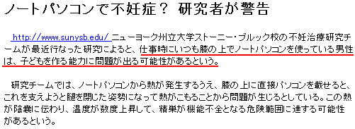 昔、家庭科のテストで、 『 冷凍食品のデメリットは? 』 という問題で、 『 愛が無い 』 と書いてマルを貰った、山田とゐちです。(実話) ちなみにオイラは 『 スーパーのお惣菜 』 がおふくろの味です。 愛 をください >誰か こんにちは。 今日、友人のお芝居を観に行った帰りの電車の中、 隣の席のおじさんが、ノートパソコンを膝の上に置き、何やら作成しているのを見かけた。 ![]() デンジャラス!! そう、、 実はちょっと前だが、こんな記事があった事を思い出した。 ![]() クリックで詳細記事へジャンプ つまり、男性のアソコにノートパソコンを押し付け続ける事により、 熱がこもって精子の数が減るというのだ。 確かに最近、電車に乗っていると、 ![]() こんな人や、 ![]() こんな人を見かける。 何となくエリートビジネスマンみたいで、カッコいい。 実際、この人達の 昼の生活はエリートビジネスマンなのだろう。 しかしこれを続けていると、 夜の生活は窓際族になってしまうのだ。 これは一大事。 それにしても危ない所だった。 オイラもお金が貯まったらノートパソコンを購入し、 こんな風に電車内でエリートビジネスマンを装い、 この 『 とゐち通信 』 を更新したいと企んでいたのだ。 もしオイラがそんな事をし始めたら、 四六時中窓際族だ。 _| ̄|○ ガクッ とにかく冒頭のおじさん。 ![]() こんな事続けてたら 会社より、母ちゃんにリストラされちまうよ… オイラは他人事ながらそう心配したわけです。 しかしおじさんは一枚上手だった! ![]() ![]() カバンでガッチリガード! でも、電車に乗る方はお分かりでしょうが、 冬場の電車は、足元から暖房熱が上昇し、 結局股間を暖めてるには変わりないんですけどね、、、これ。 おじさん頑張れよ。 ( 色んな意味で ) ■ 追記 ネットで画像検索していたらこんなのが出てきた。 ![]() 去勢手術代、助かりますね! ( 無理 ) 以上です。 お疲れ様でした。 ▲戻る |