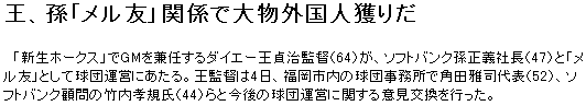 少年時代、チョコレートの匂いがする消しゴムを嗅いでいて、そのまま鼻の穴に入り、取れなくなった山田とゐちです。 こんにちは。 こんな記事を見つけた。 ![]() クリックで記事全文へ ホークス王監督とソフトバンク孫社長がメールでコミュニケーションしているというのだ。 メールって直接会ってだと話せないような心の内側をも語っちゃいますよね。 その人の裏側、素(す)の部分、趣味志向が見えたりと。 皆さんにも経験があるかと思います。 この二人は今まさに心の内側を曝け出し、本音でコミュニケーションしているのではないかと想像できる。 本音で語り合えば、きっと良い結果も出る事だろう。 ホークスの未来は明るい♪ ![]() オレ達マブだぜ♪ 当然、孫社長はインターネットに精通しているが、逆に王監督はまだまだメールには慣れていないだろう。 もしかしたら監督は、メールを通じて孫社長から『楽しいメール交換』の手ほどきでも受けているのだろうか? うーん、、 一体どういうメール交換をしてるんだろう? オイラの妄想は膨らむ。 王貞治 → 孫正義