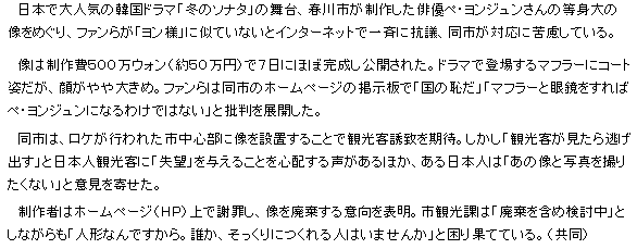 レンタルビデオ店でエッチビデオを借りる時は、必ず普通の映画2本でサンドイッチ状態にして会計に持っていく山田とゐちです。 こんにちは。 実は2日前、こんな記事を見つけていた。 ■ 2004/12/07 【 「ヨン様」像が完成 韓国・春川市、マフラー姿で微笑 】 ![]() クリックで記事へジャンプ そしてその『ヨン様』像がこれ。 ![]() ![]() オバチャン大喜び♪ このヨン様像で、観光客アップをもくろんでいるワケだ。 ところが、 ■ 2004/12/09 【 似てない?ヨン様の等身像 ファンがネット上で批判展開 】 ![]() クリックで記事へジャンプ 確かに、 ![]() 似てない しかも、 ![]() どうみてもタオル。 ![]() 農作業じゃないんだから。 そして、非難の嵐が後をたたない。 ![]() そこまで言うか。 ![]() 同意。 エリマキしてりゃ、中尾彬もヨン様だ。 ![]() ![]() 子供の頃、いじめられっ子の古川がこんな事言われてたっけ。。。 ![]() でも、 ![]() この人喜んでますよ? しかしこのヨン様像、 圧倒的多数に嫌われ 『 ヨソ様 』 扱いされる始末。 ![]() (*´゚ё゚) !! ![]() ヨン様像 大ピンチ! ![]() 市も抗議に逆ギレ状態。 早くも見放そうとしている。 ![]() 行き場を失ったヨン様像 いくら胡散臭いヨン様でも、50万円もかけたこの人形、このまま廃棄するのは勿体無い。 何とか日本で助けられないだろうか? そこで 『 ヨン様像 』 の今後を考えてみた。 ![]() オー!マイキーに出演してみる ![]() 大阪名物になってみる ![]() いっこく堂に腹話術してもらう ![]() タマちゃんと暮らしてみる ![]() 逆にタマちゃんを乗っ取る ![]() サンリオ入りする ![]() 札幌雪祭りに参加してみる ![]() 人形浄瑠璃をたしなんでみる ![]() 逆にジジィを操る ![]() 女子高生に割られる 以上、使い道ゼロ! お疲れ様でした。 ▲戻る |