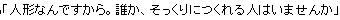 --------------------------------------------- 翻訳結果に 『 ? 』 マークが入ってしまい文章が繋がっていないけれど笑えた2作品。 でも、『 ? 』 マークもうまく文章に取り込むことが出来たら面白い文章が生まれるかもしれませんね。 ■ 『 おばあさんのテーマソング 』 タイトル決定!?(1980年代の歌謡曲にありそう)