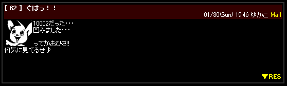 ![]() 100,000HIT踏んだ方、連絡待ってます。 山田とゐちです。 こんにちは。 一番恐れていた事が起こりそうです。 100,000HIT踏んだ人が現われない 稽古中、何人かの知人からオイラの携帯に 『 100,000HIT超えてたよ! 』 とメールが入りました。 自宅に戻ると、確かに超えてました。 そして掲示板を見るとこんな書き込みがあった。 ![]() ![]() ![]() 一万ニ。 ( 違 いやいや、、きっと100,002の間違いだと思いますが、 ゆかこさんからの申告が正しければ、 恐らく100,000HITはこの19時46分より前に達成されたと思われる。 アクセスログ解析を見ると、この時間ものすごくアクセスが集中していた事が判明した。 ゆかこさんが100,002のカウントを見て、 _| ̄|○ ガクッ となり、 すぐさま掲示板に書き込んだとすると、恐らく100,000HITは 19時40分〜19時45分頃にアクセスした誰かという事になる。。 んー。 さて、どうするか。 一応、100,000HIT突破企画予告のページで、