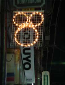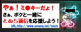 誰かが指をポキポキ鳴らしているのを見ると、自分もつい鳴らしたくなる山田とゐちです。 こんにちは。 著作権侵害スレスレの街 『 沼袋 』シリーズ。 今日はその最終回です。 昨日の日記の最後に登場した世界最強のキャラ。 ![]() 別にシルエットにしなくてももうお分かりですね。 そう、 ![]() 某デズニーの彼です このシリーズの第一回の最後で ![]() こんな電飾を紹介しました。 これは紛れも無く彼のシルエットです。 実は彼の電飾は、 これだけではなかったのです。 えっと、お見せする前に皆さんに問いたい。 『 覚悟は良いですか? 』 と もし貴方が彼のファンなら、 発狂しますよ? しばらく人と接するのが嫌になり、 旅に出たくなりますよ? それでも見ますか? 見たくなかったら 今日はこの日記を閉じて、 こちらへ非難してください。 ・・・。 良いんですか? 本当に? じゃあ、 どうぞ。 ![]() 彼のファンの皆様、どうか怒らないで下さい! きっと、一生懸命作ったんです! そうだ、こう思えばいい。 これは彼じゃない! と。 そう、これは、 ![]() ハクション大魔王なんだ。 実はもっとマトモなのもありました。 ![]() ちょっと口裂け女っぽいですが、まだ見られます。 ![]() (*´゚ё゚) !!! ![]() これはお見事 これは一連の商店街の電飾ではなく、商店街沿いにある某お店のネオンですが、 見事に彼を光で表現しています。 でも、ここまで精巧に彼を表現してしまうと、 本格的に著作権侵害の問題が浮き彫りになり、 逆にヤバいかも。 というか、、この 『 とゐち通信 』 も、 堂々と様々なキャラクターや人物の画像を掲載して、 やってる事は同じではないだろうか? いや、違う… オイラはこんな風に ![]() 宣伝してるわけではない。 多分大丈夫。 ( と信じてる 何でもアリのギリギリの街、沼袋。 何でもアリのギリギリサイト、とゐち通信。 オイラ何となく、 親近感が沸いてきました。 以上です。 お疲れ様でした。 ▲戻る |