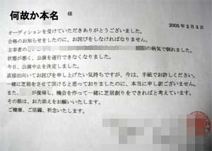 あまりの突然の出来事で無気力状態。。。 姉さん、ショックです。 山田とゐちです。 こんにちは。 ![]() この日、紀伊国屋ホール公演の合格通知が発送され、 オイラの自宅に合格通知が届いたのは一昨日だった。 ![]() ![]() 一つの小さな夢が叶ったと、オイラは無邪気に喜んだ。 しかし今日、 節分の豆まきを怠ったオイラに災いがふりかかる。 HOTROAD☆TRAINの稽古を終え、今日も深夜帰宅。 ポストを開けると一通の手紙が。 先日オーディションに合格した紀伊国屋ホール公演の団体からだ。 ![]() ![]() ![]() ![]() ![]() 主宰者 ( 団体のリーダー ) が病気で倒れ、公演中止となってしまったのだ。 ![]() ![]() これは何かの冗談だろうか? 未だに信じられない。 もしかしたらオイラを一旦合格にしたものの、何らかの理由で不要となり、 不合格通知を遠まわしに書いて送ってきたのではないかと思ってしまう。 いや、そんな事をするようないい加減な団体ではない。 実際この団体の前回の公演も、新作公演をする予定が、 主宰者の体調不良により、急遽過去に上演した作品を再演するハメになっていたのだ。 今回もそうすれば良いのに… とにかく明日、この団体に電話をして詳細を聞いてみようと思う。 紀伊国屋デビューのお祝いメールや掲示板へのカキコミをして下さった皆様、 期待させてすみませんでした。。 主宰者の方が復帰次第、新作公演をするそうなので、 その時また、オーディション受けて合格してやろうと思ってます。 優先的にキャスティングしてくれたら嬉しいなと期待しつつ… 山田とゐち31歳。 2005年、スタートダッシュでいきなりコケました。 今夜の酒は泪で割ろう… てか、 正直かなりショック受けて1時間位呆然として立ち上がれなかったのに 即座にネタにしてしまうオイラって、 自虐的。 とりあえず、過ぎた事は仕方ない。 気持ちを切り替えて、3月HOTROAD☆TRAIN公演に全力注ぎます! 芸能関係の皆様へ。( いないと思うが… 3月7日〜4月中旬まで山田とゐちはスケジュールがら空きでございます。 オーディション、面談何でも受けてたちます。 お気軽にお声をおかけ下さい。 とゐち菌感染者様へ。 ← オラに元気を分けてくれ!以上です。 お疲れ様でした。 ▲戻る |
