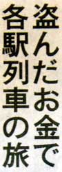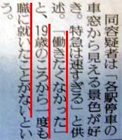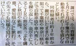 そういえば、うちの会社でも 『 クールビズ 』 始まりました。 そんでもって何だかいつもより熱いなぁ…って思ったら、 エアコンの温度が28度になってました。 暖房で。 社内温暖化警報発令中! 山田とゐちです。 こんにちは。 カレー屋に置いてある新聞にこんな記事が載っていた。 ![]() ![]() *新聞ですので右から繋げて読んで下さい ( デジカメで撮影した為見づらくてすみません… ) 簡単に説明すると、犯人は車を盗んだり、車上荒らしをしてお金を盗み、 そのお金で各駅列車の旅を楽しんでいたというのだ。 3年間で3600万円、年収にして1200万円。 平均すると月収約100万円稼いでいたというワケだ。 いや、この場合稼ぐという言葉を使うのはおかしいか? でもこの記事でオイラが一番驚いたのは金額ではない。 実はこの記事には続きがあった。 ![]() (*´゚ё゚) コレッテ、、
