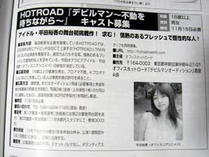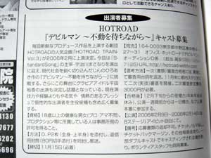 オイラが仕事で使っている会社のパソコンよりも 休憩室に置いてある遊び用のパソコンの方がスペックが良いという事実。 これは何者かによる陰謀だろうか。 山田とゐちです。 こんにちは。 ![]() 11月1日発売の 『 月刊オーディション 』 『 月刊デ・ビュー 』 という芸能オーディション専門誌に 『 デビルマン 』 の募集情報が掲載されました! 両誌ともに無料で掲載してもらえる為、 毎月かなり多数の劇団や制作会社等から掲載依頼の応募が来るらしく、 それを編集部で選抜した上で掲載するらしいのです。 そこでオイラもダメモトで応募してみたところ、 見事に両方の雑誌に掲載されることになったんです。 原稿提出したのが締切から1週間過ぎてたので絶対ダメだと思ってたのに… さて、一体どんな形で掲載されているのか? ■ 月刊デ・ビューの場合 1ページ1ページ丁寧に観ていったが、 募集コーナーのどこを見てもどこにも掲載されておらず、 『 デ・ビュー編集部に騙されたか? 』 と落胆しかけたその時だった。 ![]() あ。 ![]() ![]() ![]() 別枠掲載キターッ! 何と通常の募集ページとは別に設けてある特集ページの中に、 記事として組み込まれていたのだ! ( 115ページに掲載されてます ) 個人的には大きく取り扱ってくれて凄く嬉しい反面、 こういう特集ページってみんな読んでいるんだろうか?と不安だったりもします… 立ち読みレベルだったらなかなか気付いてもらえないでしょうね。。。 でも編集部がこの公演に話題性があると判断し、 こういう形で掲載してくれた事に正直感動しました。 ■ 月刊オーディションの場合 ![]() ![]() ![]() ![]() 3分割掲載キターッ! ( 82ページ ) ![]() 通常、写真の左ページのように 『 1ページあたり6分割 』 で掲載されるんですが、 なんとオイラの記事は3分割で大きく取り上げられていたんです。 これはかなり目立つ こんな事ならとゐ通のURLも原稿に入れておくべきだった… ( その時点で不採用決定 ) 受験されない方も本屋に行って きっと沢山の方が応募してきて下さると信じてます。 とにかく沢山の人に受けて貰いたいですね。 これからオイラと一緒に大きくなりたいって思ってくれる人とか、 カッコつけずに肩の力を抜いたナチュラルな人に沢山会ってみたいです。 オーディションってどうしても緊張しちゃうモノだと思うんですよ。 応募者が多ければ多いほど特にそうなると思います。 絶対無理だとか、受けるだけ損だとか思っちゃうモノです。 でも思い出作りなレベルで気軽に受けたりすると逆に良い結果が出たりするんですよね。 てかね、ホント、受験される方は緊張とかイラナイですよ? だって、、、 ![]() ![]() 審査員はオイラだから… 審査員席で待ってます。 ( 偉そうに ) 以上です。 お疲れさまでした。 ▲戻る |