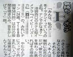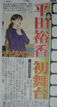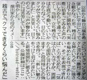 秋葉原に行くと電磁波で手がむくみます。 こんにちは。 稽古中にサンケイスポーツの記者さんが取材におみえになった。 『 平田裕香初舞台 』 を記事にして頂くことになったんです。 ![]() 15日、早速サンスポを買ってみた。 芸能面を開いてみると… ![]() ![]() ![]() デッカく掲載 ![]() なんと1面の約8分の1を使って大きく取り上げて頂くという快挙! 山田とゐちプロデュース公演がこんなに大きな記事に… ![]() ![]() ![]() ![]() 何がスゴいってアレですよ。 どれだけデカく掲載されたかっていうとですね、 ![]() 世界のブラピの2倍のデカさですよ。 ![]() 和田アキ子なんて踏み潰せる位ちっちゃいですよ! ![]() みのもんたなんてノミもんたですよ! ( 謎 ) でもやっぱり… ![]() エロには勝てんのか。 やっぱり時代はエロスですよね! ( オチがまさかのエロネタへ ) -- 追伸 -- 1月15日のサンスポを観られなかった方の為に記事を貼り付けておきますね。 ![]() ![]() ―― 2006年1月15日 サンケイスポーツ芸能面 ―― SANSPO.COMにも記事が掲載されています! 【 記事はこちら 】 昨日この記事を御覧になられた方からのアクセスが集中して、 劇団サイトがちょっとだけパンクしました。 新聞の効果ってスゴいですね。。 以上です。 お疲れさまでした。 ▲戻る |