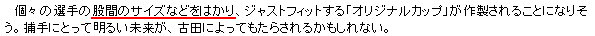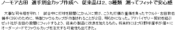 ダンス発表会を明後日に控えた中西ひふみが久々に稽古場に現れた。 ![]() ん。 ![]() あなた… 女子プロレスラーですか。 四角い顔して四角いリングで闘うつもりですか。 どうやら、明後日開催されるダンス発表会用のヘアースタイルらしい。 かなり大勢出演者がいる為、コレ位やらないと目立たないとの事。 いやね、こんな髪型にしなくても、 貴女十分目立ってます。 上から撮影してみた。 ![]() なんかこれ… ![]() アンモナイト? 中西ひふみの頭に古代生物生存中。 山田とゐちです。 こんにちは。 こんな記事を見つけた。 ![]() クリックで記事全文へジャンプ どうやら先日の古田の睾丸打撲を今後回避する為に、 特製ファウルカップが作製される事になったようだ。 今日のスポーツ新聞を見てみると、 それぞれのサイズのファウルカップがイメージされていた。 ![]() 左から石川、五十嵐、石井弘寿。 そして、 ![]() 左から古田、ラミレ… Σ (*´゚ё゚) !! ![]() ![]() ![]() ラミレスでけぇー!! ![]() この男、 アソコもメジャー級 と同時に、 ヤクルトの日本人選手達は、 まさにこの記事で、 チ●コサイズを世間に晒されるハメになったワケで… ご冥福をお祈りします。 記事には続きがあった。 ![]() 一体どうやって測るんだろう… 特に見栄っ張りなプロ野球選手から 正確なチンコの長さが計測出来るとは思えないのだが… オイラだったら絶対、 エロ本持参で計測に挑みます! ( 意味無し ) (*´゚ё゚) … 空が見たくなった… 何処までも広がる青い空を… なんか、、そんな気分なんだ… 以上です。 お疲れさまでした。 ▲戻る |