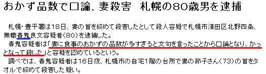 先ほどから涙と鼻水が止まらない山田とゐちです。 ( 花粉で こんにちは。 14歳にして、とゐち菌に感染してしまったキノコさんがニュースを教えてくれた。 ![]() クリックで記事全文へジャンプ 青鬼って、凄い苗字ですね。。 『 アオキさん 』 って読むんでしょうかね? それにしてもまた老夫婦の喧嘩、、。 以前にも 『 夫が浮気してる 』 ってお婆ちゃんが勘違いしてマサカリを振り回してましたよね。 *その時の日記はこちら しかし、おかずの多さにキレるというのはどういう事だろう? おかずが少なくてキレる事はあっても、 多い分には残して明日にでも食べれば良いんじゃないかと思ってしまう。 これは何か他に理由があるんじゃないだろうか? オイラの妄想が始まった。 きっと事件の真相はこうに違いない。 ( 注:今日のネタはブラックです ) おい、ババァ! んだよ、うっせーな 何で今日はおかずが多いんじゃい、ワレ 自分の胸に聞いてみなっ! 知るか! 無駄遣いすんなって言ってんだろが、ボケ!! このスケベ爺がっ!! おいテメェ、話すり替えてんじゃねぇぞ、タレ乳が! 知ってんだからね? 何がだよ?黙って一枚の写真を差し出すババァ。 ![]() あ。 あ。じゃないわよ、デレデレしちゃってさ。 何でオマエがそれ持ってんだよ? 返せよ! 知ってんだから、アタシ。 だから何をだよ。 風呂上りにこの写真おかずにしてマス掻いてるだろ? 掻いてねぇよっ!! 風呂上りにまた汚してどうすんだよ、馬鹿かテメェは。 だから掻いてねぇっつうの!! だからアタシは今晩サービスしてやったのさ! あ? 今晩のおかずをいっぱい用意してね! は? もうそのおかず(写真)に飽きる頃だと思ったからさっ! おかず違いじゃねぇかよ!こんなんで掻けるか! ホラ、やっぱ掻いてんじゃん。 あ。 ジジィの自慰行為は自殺行為だ!と、写真を破るババァ。 ![]() ビリッ!! ![]() ![]() キレた! なまらムカついた!*なまら=北海道の方言で、『 とても、すごく 』 ムカつけ、ムカつけ! おかず無し〜♪![]() ![]() ギャアアアアアアア!!![]() 妻の首をタオルで絞めようとする夫 【 イメージです 】 どうだ…ハァハァ…参ったか…ハァハァ… アンタ…![]() ![]() パタンッ… あ。札幌の街の春は遠い…。 以上です。 お疲れさまでした。 ▲戻る |