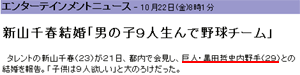 今日は、本来なら別のお話を書こうかと思っていた。 だが、この衝撃的事件を放置しておくわけにはいかない。 森川氏と関屋氏の3人で稽古終了後にラーメンを食べに行った。 森川君の稽古場日記へジャンプ オイラはラーメン屋にあったスポーツ新聞を読みながら、稽古後のゆっくりした時間を堪能するはずだった。 しかし、事態は思わぬ方向へと転換する。 おもむろに開いたスポーツ新聞に、オイラの眼を点にする驚愕の事実が記されていたのだ。 新山千春(23) 結婚_| ̄|○ガクッ ヤラレタ。。。 何故ゆえそんなに凹むのか。 そう、、 オイラが俳優業をする100の理由の一つ。 新山千春と船上ウェディング オイラの妄想脳内で極秘に進行していたこの『黒い目標』が、今まさに粉々に砕け散り、儚くも深海魚の餌となり消えてしまったからだ。 ![]() 船上ウエディングで幸せな表情で記念撮影する 山田とゐち(左)と新山千春(右) ムキィィィィィ〜!!!!! 相手は誰だ? すぐさま記事を読んでみる。 ![]() クリックでジャンプ 巨人・黒田哲史(29) ウワ━━━━━━━━━━ヽ(`Д´)ノ━━━━━━━━━━ン!! 巨人の黒田といえば、元西武ライオンズの内野手。 巨人嫌いで西武ファンのオイラに対するあてつけとしか思えない。 ![]() ![]() 今年6月?? まだ5ヶ月位しか経ってない。。 まさに超スピード結婚だ。 そうか、、オイラが鬱状態でキン肉マンを読みふけっていた頃、きっと黒田は『新山千春に告るぞ計画』を練っていたに違いない。 ![]() テ… テレビ電話でプロポーズだぁ??? このヤロ…近未来テクノロジーをフルに活用しやがって。。 俺だって、俺だってなぁ、テレビ電話でプロポーズ位出来るんだぞ!! ![]() ただな、、、 プロポーズする 相手がいないだけなんだよ (*´゚ё゚) … ![]() チ…チィ!!! おのれ…気安く呼びやがって… いいか、黒田よ。 今後のためにひとつ教えてやる。 チイというニックネームはな、 ![]() 斉藤千春 地井武男 この二人専用なんだよ!! ![]() …なぁ、黒田ちゃんよぉ。 これはオイラに対する 宣戦布告 と考えていいかい? よし、その勝負受けてたつ。 『黒田兄弟野球軍』を滅多打ちにしてやる。 よ、、よぉし、、 オイラも子供9人作って、 ![]() 黒田よ、そして愛しの新山千春よ。 日本シリーズで会おう。 _| ̄|○ 以上、負け犬の独り遠吠えでした。 今夜の酒は涙で割ろう… ■□■□■□■□■□■□ 終 了 □■□■□■□■□■□■ 戻る▲ |