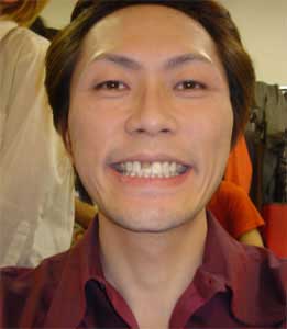 11月7日夜、千秋楽公演本番中。 ヤクの売人役で暴れている時、 事件は起こった。 ![]() (*´゚ё゚) … ![]() 差し歯が折れたー!! 那須ちゃんとひふみちゃんが演じるギャルともみ合ってる際に、自分の下の歯で上の差し歯を粉砕。 ![]() 11月7日夜公演を観られた方でお気づきになった方はいらっしゃっただろうか? おいおいどうする、、この後この歯で五條かよ・・・ 五條はお芝居の中で結構いやらしく笑ったりしていたので、確実に歯を見せる。 しかも一番気がかりだったのは、ラストシーンでしげるの元奥さんが好きだったという事を告白する。 大切なオイラの見せ場だというのに、 こんな歯で、、、 笑われないだろうか・・・ そんな事で頭がいっぱいになる。 今思うと、そんなに目立つものでもなく、観客も気づく人は少なかっただろう。 でもあの本番真っ最中はそういう後向きな不安ばかりで、正直頭の中が混乱したまま五條を演じていた。 正直に申します。 この日の公演を観られた方の中で気づかれた方も多いでしょう。 一箇所台詞飛びました。 _| ̄|○ ガクッ まだまだオイラって未熟だなぁ… 歯が欠けた程度でパニくるなんて… それにしても、歯というのは大切。 一本欠けるだけで、息の出方が全く変わりました。 何となく、オイラの発する台詞にスースー息が抜けていたり、カツゼツが悪くなったりするんですね。 皆さんも、ギャルをナンパする時は、歯が欠けないように注意しましょうね! 色々ありましたが、無事千秋楽を終える事が出来ました。 応援して下さった皆さん、本当にありがとうございました! 戻る▲ |